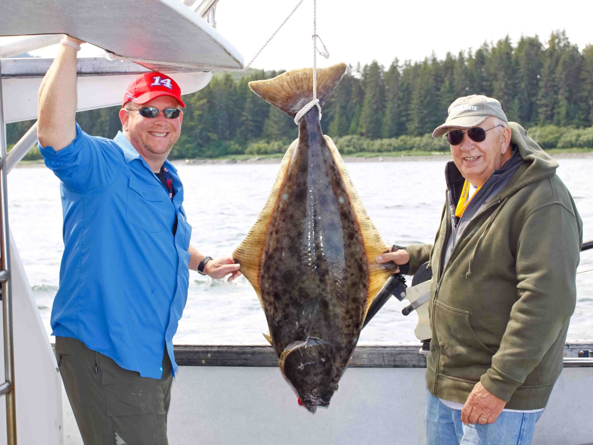 Our final tally: 56 halibut in two hours and 45 minutes – with three bruised, battered and muscle weary fishermen. Larry won the day with 24, LJ with 19 and me with 13. Larry also had the largest at 45 inches / approximately 45 pounds. That was interesting because it actually required two shots in the head from a 22 to stun it enough to get it in the boat! We had kept one of LJ’s as well so we took photos on the way back to the dock. We came in and Chris fileted the fish right on board and we took it across the street from the harbor for processing and shipping. Between the two fish we had about 30 pounds of fish, thankfully we were able to donate 15 to the local senior center and then ship 15 back home. What a day!!!
