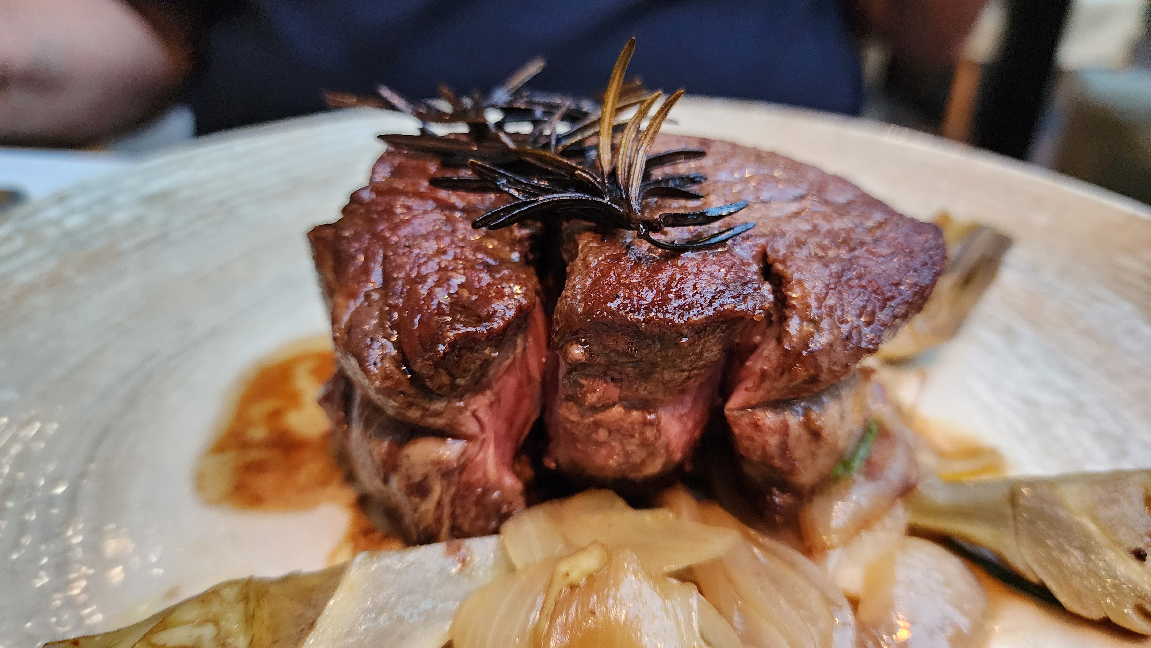 Third Course, Barry had the perch filets, Brenda and I each had filet, L.J. had the Milanese veal cheeks with polenta, also pictured were Brenda’s vegetables which unfortunately did not arrive with her filet.
